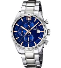 movimiento de cuarzo (con batería) que, como es habitual en los relojes Festina, garantiza un cronometraje preciso y ofrece las siguientes funciones: 24 horas, Cronógrafo, Fecha, Minuto, Segundo, Hora.