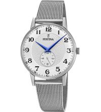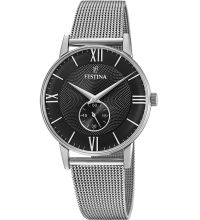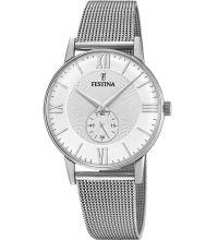 El brazalete de Acero inoxidable de alta calidad - color: Plata - con La hebilla del clip desplegable le proporcionará un placer adicional con su nuevo reloj Festina. El brazalete de Acero inoxidable ofrece una gran comodidad de uso y puede llevarse hasta una circunferencia de muñeca máxima de 210 mm.