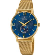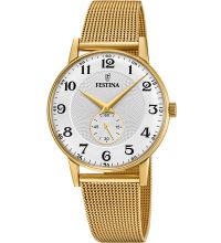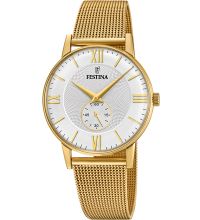El brazalete de Acero inoxidable de alta calidad - color: Oro - con La hebilla del clip desplegable le proporcionará un placer adicional con su nuevo reloj Festina. El brazalete de Acero inoxidable ofrece una gran comodidad de uso y puede llevarse hasta una circunferencia de muñeca máxima de 210 mm.