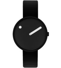 | Picto® cuestiona la idea del reloj clásico con dos agujas y una esfera con números. Aquí, la hora se indica mediante un punto en la esfera giratoria, mientras que los minutos se indican mediante una aguja convencional. |  |