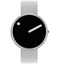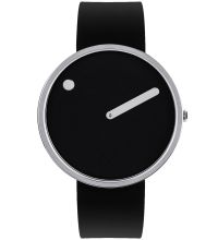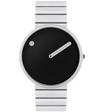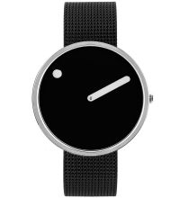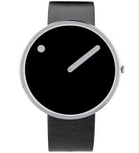 Picto® cuestiona la idea del reloj clásico con dos agujas y una esfera con números. Aquí, la hora se indica mediante un punto en la esfera giratoria, mientras que los minutos se indican mediante una aguja convencional. |  |